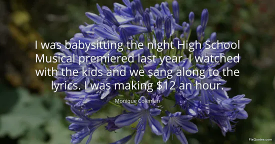 The subtext is a quiet indictment of how entertainment sells aspiration while obscuring labor. High School Musical is basically a product engineered to feel like belonging - catchy lyrics, easy choreography, a communal sing-along vibe. Coleman places herself inside that consumer moment as an ordinary adult supervising kids, not as the polished face of the brand. That dissonance gives the quote its bite: she’s literally watching the dream with the people it’s marketed to, while still earning barely-more-than-minimum wage.