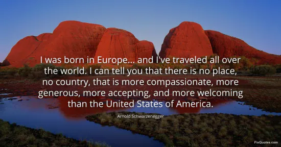 Schwarzenegger, Arnold. "I was born in Europe... and I've traveled all over the world. I can tell you that there is no place, no country, that is more compassionate, more generous, more accepting, and more welcoming than the United States of America." FixQuotes. January 18, 2026. https://fixquotes.com/quotes/i-was-born-in-europe-and-ive-traveled-all-over-18518/.