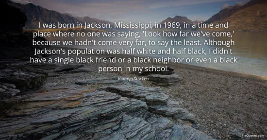 Stockett, Kathryn. "I was born in Jackson, Mississippi, in 1969, in a time and place where no one was saying, 'Look how far we've come,' because we hadn't come very far, to say the least. Although Jackson's population was half white and half black, I didn't have a single black friend or a black neighbor or even a black person in my school." FixQuotes. January 16, 2026. https://fixquotes.com/quotes/i-was-born-in-jackson-mississippi-in-1969-in-a-91981/.