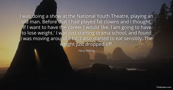 Melling, Harry. "I was doing a show at the National Youth Theatre, playing an old man. Before that I had played fat clowns and I thought, 'If I want to have the career I would like, I am going to have to lose weight.' I was just starting drama school, and found I was moving around a lot. I also started to eat sensibly. The weight just dropped off." FixQuotes. January 15, 2026. https://fixquotes.com/quotes/i-was-doing-a-show-at-the-national-youth-theatre-158406/.