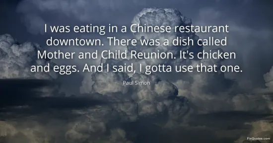 Simon, Paul. (2026, January 16). I was eating in a Chinese restaurant downtown. There was a dish called Mother and Child Reunion. It's chicken and eggs. And I said, I gotta use that one. FixQuotes. https://fixquotes.com/quotes/i-was-eating-in-a-chinese-restaurant-downtown-82492/
