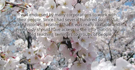 "I was endorsed by many corporations to work with their people. Since I had several hundred successful case histories, I realized that it was really valuable and everybody should have access to the information, so I started teaching seminars to groups of people." FixQuotes, 16 Jan. 2026, https://fixquotes.com/quotes/i-was-endorsed-by-many-corporations-to-work-with-110120/. Accessed 21 Feb. 2026.