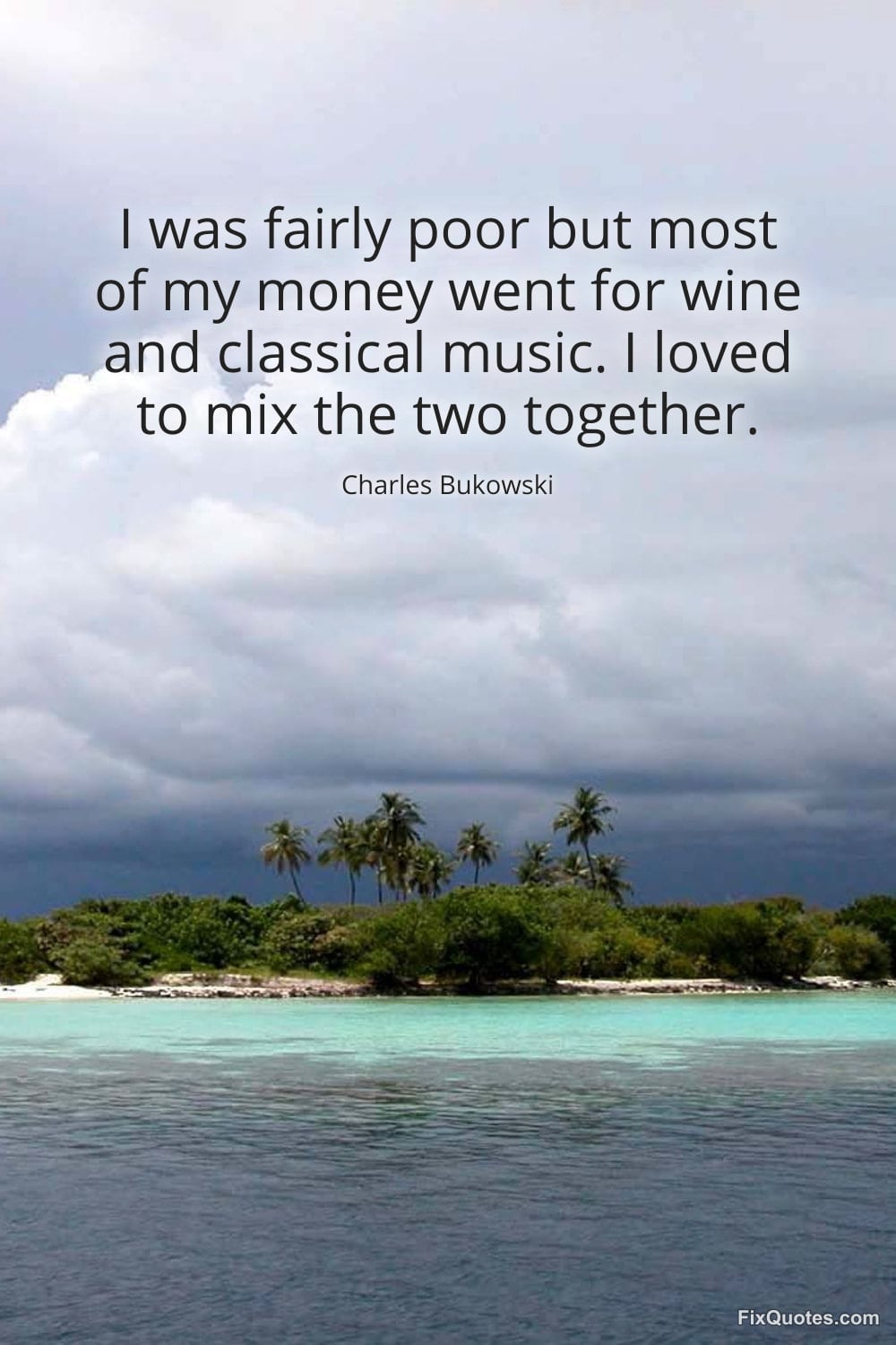Bukowski, Charles. (2026, February 10). I was fairly poor but most of my money went for wine and classical music. I loved to mix the two together. FixQuotes. https://fixquotes.com/quotes/i-was-fairly-poor-but-most-of-my-money-went-for-185185/