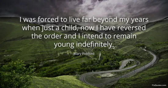 Pickford, Mary. "I was forced to live far beyond my years when just a child, now I have reversed the order and I intend to remain young indefinitely." FixQuotes. January 16, 2026. https://fixquotes.com/quotes/i-was-forced-to-live-far-beyond-my-years-when-104539/.