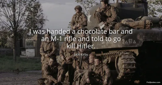 Kirby, Jack. "I was handed a chocolate bar and an M-1 rifle and told to go kill Hitler." FixQuotes. January 11, 2026. https://fixquotes.com/quotes/i-was-handed-a-chocolate-bar-and-an-m-1-rifle-and-123582/.