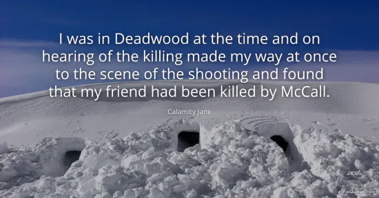 Jane, Calamity. "I was in Deadwood at the time and on hearing of the killing made my way at once to the scene of the shooting and found that my friend had been killed by McCall." FixQuotes. January 15, 2026. https://fixquotes.com/quotes/i-was-in-deadwood-at-the-time-and-on-hearing-of-16916/.