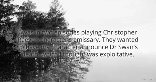 Kidder, Margot. (2026, January 16). I was in two episodes playing Christopher Reeve's character's emissary. They wanted to have my character announce Dr Swan's death, which I thought was exploitative. FixQuotes. https://fixquotes.com/quotes/i-was-in-two-episodes-playing-christopher-reeves-104122/