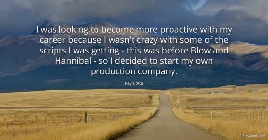 Liotta, Ray. "I was looking to become more proactive with my career because I wasn't crazy with some of the scripts I was getting - this was before Blow and Hannibal - so I decided to start my own production company." FixQuotes. January 16, 2026. https://fixquotes.com/quotes/i-was-looking-to-become-more-proactive-with-my-128905/.