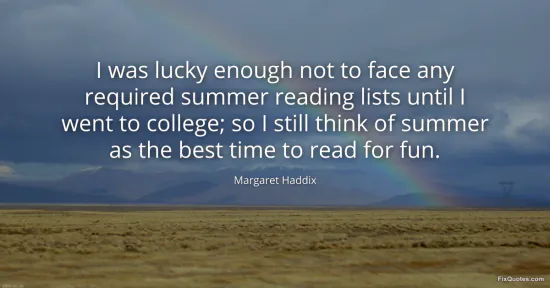 Haddix, Margaret. (2026, February 16). I was lucky enough not to face any required summer reading lists until I went to college; so I still think of summer as the best time to read for fun. FixQuotes. https://fixquotes.com/quotes/i-was-lucky-enough-not-to-face-any-required-127706/