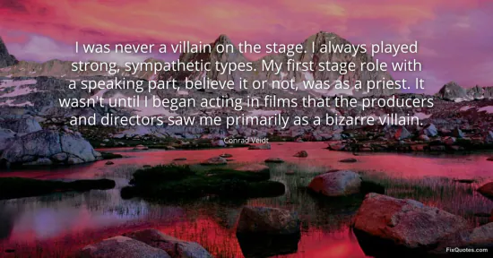 Veidt, Conrad. "I was never a villain on the stage. I always played strong, sympathetic types. My first stage role with a speaking part, believe it or not, was as a priest. It wasn't until I began acting in films that the producers and directors saw me primarily as a bizarre villain." FixQuotes. January 17, 2026. https://fixquotes.com/quotes/i-was-never-a-villain-on-the-stage-i-always-48980/.