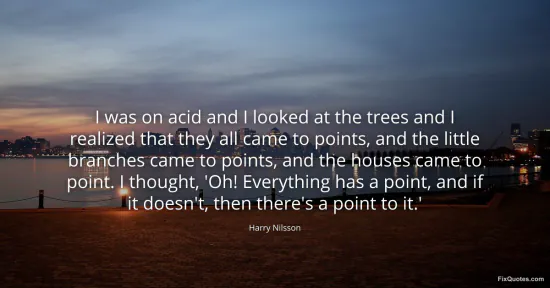 Nilsson, Harry. (2026, January 17). I was on acid and I looked at the trees and I realized that they all came to points, and the little branches came to points, and the houses came to point. I thought, 'Oh! Everything has a point, and if it doesn't, then there's a point to it.'. FixQuotes. https://fixquotes.com/quotes/i-was-on-acid-and-i-looked-at-the-trees-and-i-61739/