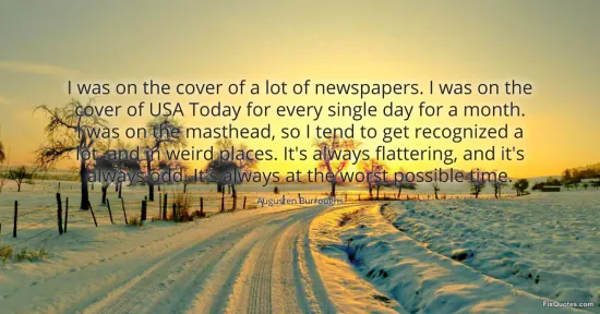 Burroughs, Augusten. "I was on the cover of a lot of newspapers. I was on the cover of USA Today for every single day for a month. I was on the masthead, so I tend to get recognized a lot, and in weird places. It's always flattering, and it's always odd. It's always at the worst possible time." FixQuotes. January 17, 2026. https://fixquotes.com/quotes/i-was-on-the-cover-of-a-lot-of-newspapers-i-was-74832/.