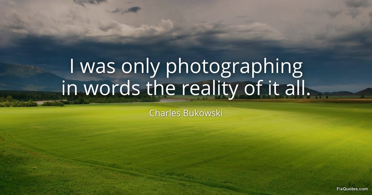 Bukowski, Charles. (2026, February 10). I was only photographing in words the reality of it all. FixQuotes. https://fixquotes.com/quotes/i-was-only-photographing-in-words-the-reality-of-185254/