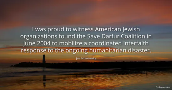 Schakowsky, Jan. "I was proud to witness American Jewish organizations found the Save Darfur Coalition in June 2004 to mobilize a coordinated interfaith response to the ongoing humanitarian disaster." FixQuotes. January 17, 2026. https://fixquotes.com/quotes/i-was-proud-to-witness-american-jewish-56449/.