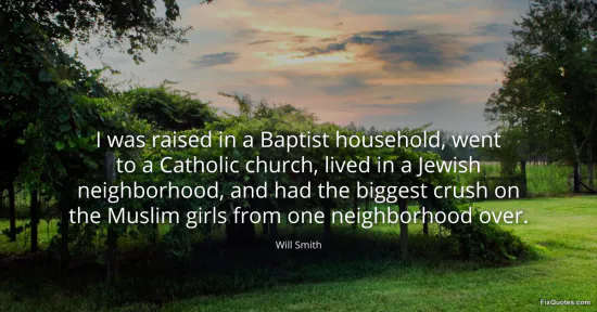Smith, Will. (2026, January 15). I was raised in a Baptist household, went to a Catholic church, lived in a Jewish neighborhood, and had the biggest crush on the Muslim girls from one neighborhood over. FixQuotes. https://fixquotes.com/quotes/i-was-raised-in-a-baptist-household-went-to-a-172593/