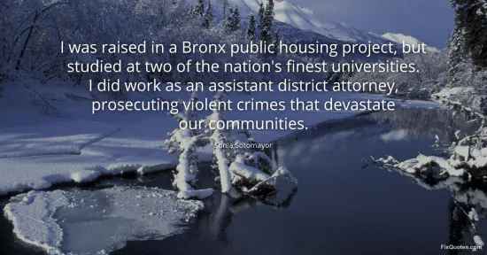 Sotomayor, Sonia. (2026, January 17). I was raised in a Bronx public housing project, but studied at two of the nation's finest universities. I did work as an assistant district attorney, prosecuting violent crimes that devastate our communities. FixQuotes. https://fixquotes.com/quotes/i-was-raised-in-a-bronx-public-housing-project-65663/