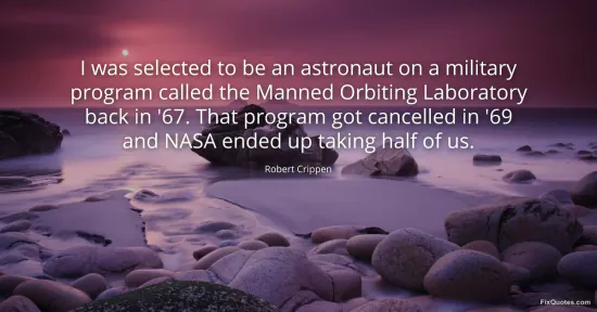 Crippen, Robert. "I was selected to be an astronaut on a military program called the Manned Orbiting Laboratory back in '67. That program got cancelled in '69 and NASA ended up taking half of us." FixQuotes. January 17, 2026. https://fixquotes.com/quotes/i-was-selected-to-be-an-astronaut-on-a-military-77017/.