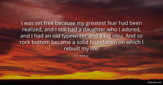 Rowling, J. K. "I was set free because my greatest fear had been realized, and I still had a daughter who I adored, and I had an old typewriter and a big idea. And so rock bottom became a solid foundation on which I rebuilt my life." FixQuotes. January 17, 2026. https://fixquotes.com/quotes/i-was-set-free-because-my-greatest-fear-had-been-31648/.
