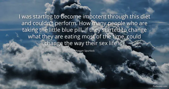 Spurlock, Morgan. (2026, January 16). I was starting to become impotent through this diet and couldn't perform. How many people who are taking the little blue pill, if they started to change what they are eating most of the time, could change the way their sex life is? FixQuotes. https://fixquotes.com/quotes/i-was-starting-to-become-impotent-through-this-88750/