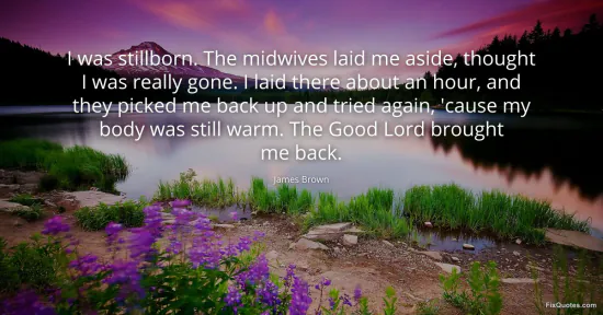 Brown, James. "I was stillborn. The midwives laid me aside, thought I was really gone. I laid there about an hour, and they picked me back up and tried again, 'cause my body was still warm. The Good Lord brought me back." FixQuotes. January 16, 2026. https://fixquotes.com/quotes/i-was-stillborn-the-midwives-laid-me-aside-102164/.