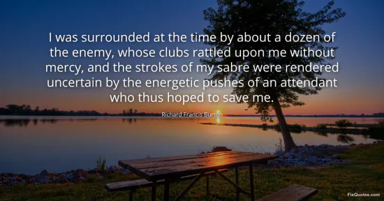 Burton, Richard Francis. "I was surrounded at the time by about a dozen of the enemy, whose clubs rattled upon me without mercy, and the strokes of my sabre were rendered uncertain by the energetic pushes of an attendant who thus hoped to save me." FixQuotes. January 17, 2026. https://fixquotes.com/quotes/i-was-surrounded-at-the-time-by-about-a-dozen-of-71036/.