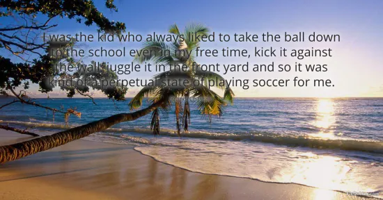 "I was the kid who always liked to take the ball down to the school even in my free time, kick it against the wall, juggle it in the front yard and so it was kind of a perpetual state of playing soccer for me." FixQuotes, 16 Jan. 2026, https://fixquotes.com/quotes/i-was-the-kid-who-always-liked-to-take-the-ball-109830/. Accessed 13 Feb. 2026.