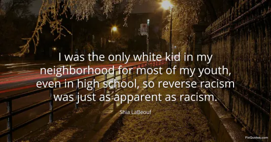 LaBeouf, Shia. (2026, February 17). I was the only white kid in my neighborhood for most of my youth, even in high school, so reverse racism was just as apparent as racism. FixQuotes. https://fixquotes.com/quotes/i-was-the-only-white-kid-in-my-neighborhood-for-98897/