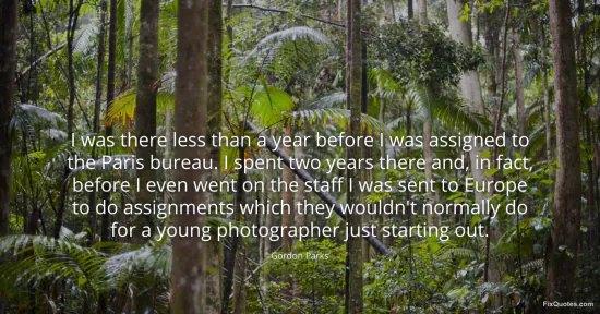 Parks, Gordon. (2026, January 17). I was there less than a year before I was assigned to the Paris bureau. I spent two years there and, in fact, before I even went on the staff I was sent to Europe to do assignments which they wouldn't normally do for a young photographer just starting out. FixQuotes. https://fixquotes.com/quotes/i-was-there-less-than-a-year-before-i-was-66475/