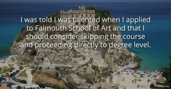 Dyer, John. (2026, January 16). I was told I was talented when I applied to Falmouth School of Art and that I should consider skipping the course and proceeding directly to degree level. FixQuotes. https://fixquotes.com/quotes/i-was-told-i-was-talented-when-i-applied-to-91773/