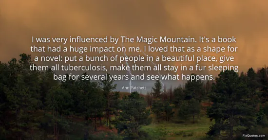 Patchett, Ann. "I was very influenced by The Magic Mountain. It's a book that had a huge impact on me. I loved that as a shape for a novel: put a bunch of people in a beautiful place, give them all tuberculosis, make them all stay in a fur sleeping bag for several years and see what happens." FixQuotes. January 15, 2026. https://fixquotes.com/quotes/i-was-very-influenced-by-the-magic-mountain-its-a-61934/.