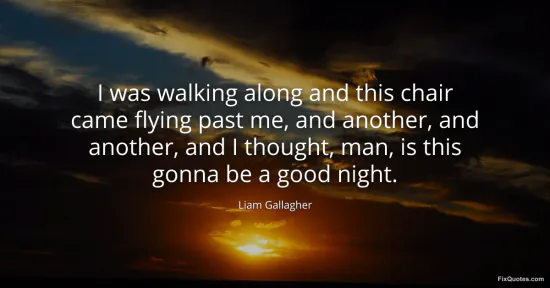Gallagher, Liam. (2026, January 16). I was walking along and this chair came flying past me, and another, and another, and I thought, man, is this gonna be a good night. FixQuotes. https://fixquotes.com/quotes/i-was-walking-along-and-this-chair-came-flying-107668/