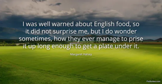 Halsey, Margaret. "I was well warned about English food, so it did not surprise me, but I do wonder sometimes, how they ever manage to prise it up long enough to get a plate under it." FixQuotes. January 16, 2026. https://fixquotes.com/quotes/i-was-well-warned-about-english-food-so-it-did-104055/.