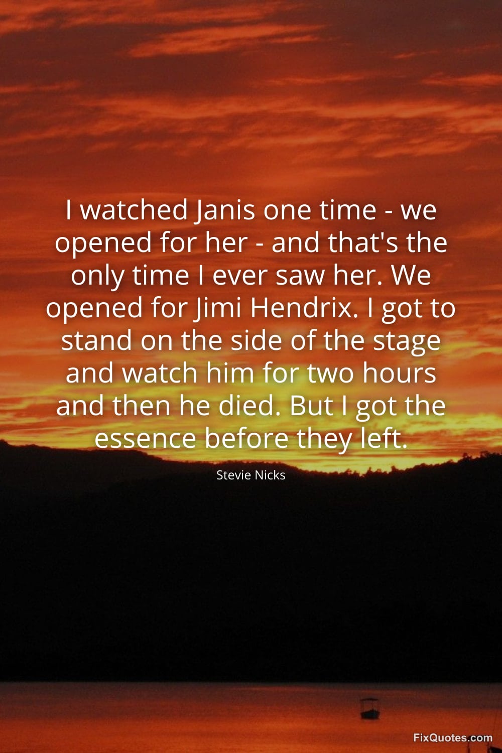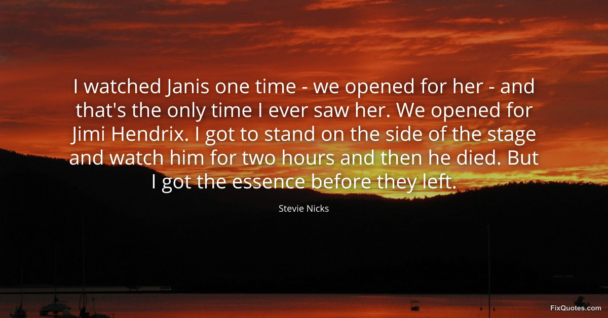 Nicks, Stevie. (2026, January 15). I watched Janis one time - we opened for her - and that's the only time I ever saw her. We opened for Jimi Hendrix. I got to stand on the side of the stage and watch him for two hours and then he died. But I got the essence before they left. FixQuotes. https://fixquotes.com/quotes/i-watched-janis-one-time-we-opened-for-her-159733/