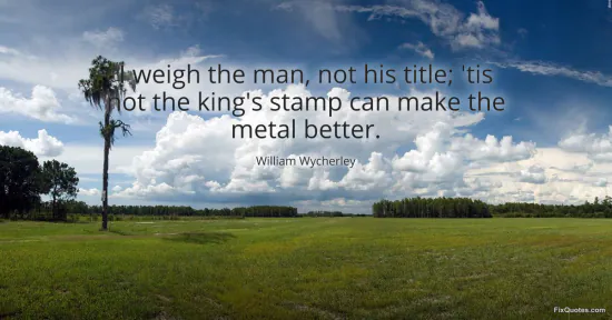 Wycherley, William. (2026, January 17). I weigh the man, not his title; 'tis not the king's stamp can make the metal better. FixQuotes. https://fixquotes.com/quotes/i-weigh-the-man-not-his-title-tis-not-the-kings-27644/