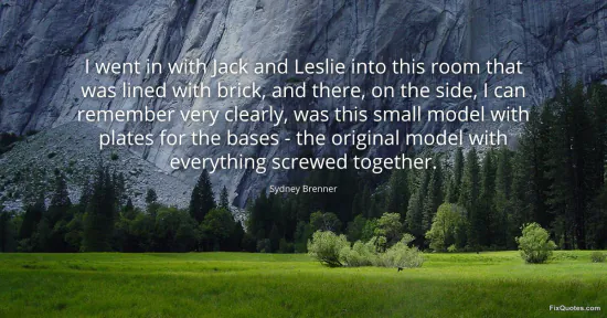 Brenner, Sydney. "I went in with Jack and Leslie into this room that was lined with brick, and there, on the side, I can remember very clearly, was this small model with plates for the bases - the original model with everything screwed together." FixQuotes. February 16, 2026. https://fixquotes.com/quotes/i-went-in-with-jack-and-leslie-into-this-room-116111/.