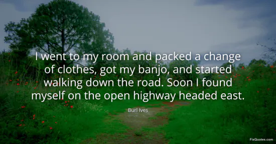 Ives, Burl. (2026, January 15). I went to my room and packed a change of clothes, got my banjo, and started walking down the road. Soon I found myself on the open highway headed east. FixQuotes. https://fixquotes.com/quotes/i-went-to-my-room-and-packed-a-change-of-clothes-123651/