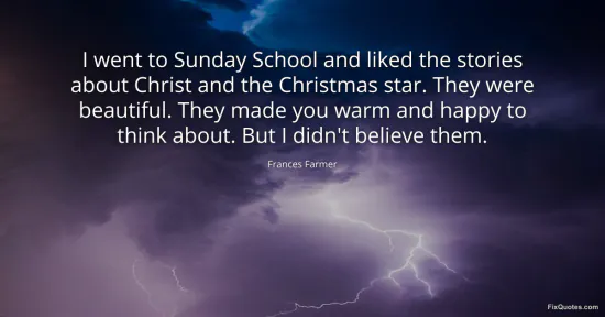 Farmer, Frances. "I went to Sunday School and liked the stories about Christ and the Christmas star. They were beautiful. They made you warm and happy to think about. But I didn't believe them." FixQuotes. January 16, 2026. https://fixquotes.com/quotes/i-went-to-sunday-school-and-liked-the-stories-130170/.
