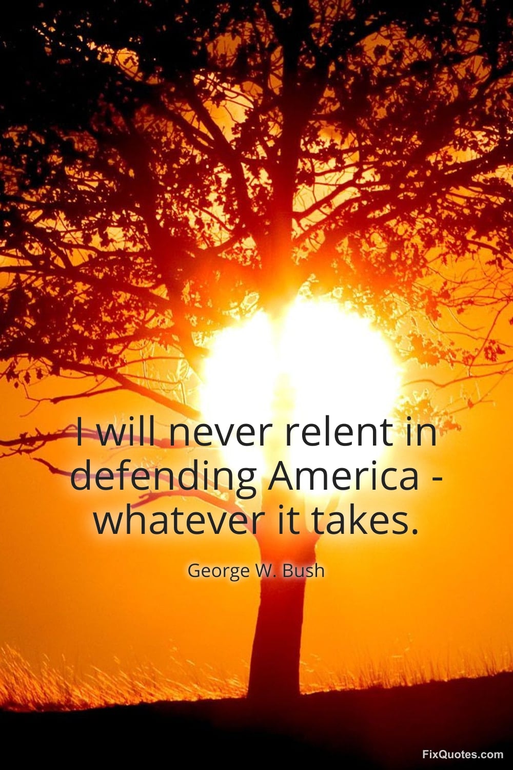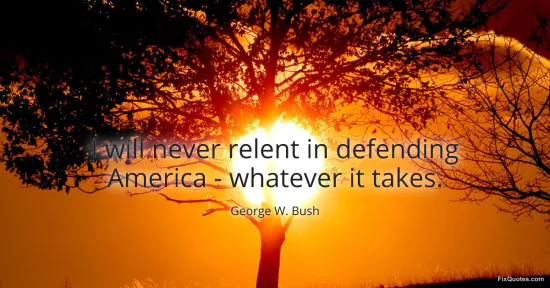Bush, George W. "I will never relent in defending America - whatever it takes." FixQuotes. January 18, 2026. https://fixquotes.com/quotes/i-will-never-relent-in-defending-america-7275/.