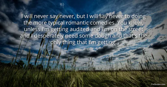 Bale, Christian. "I will never say never, but I will say never to doing the more typical romantic comedies. You know, unless I'm getting audited and I'm on the street and I desperately need some dough and that's the only thing that I'm getting." FixQuotes. January 17, 2026. https://fixquotes.com/quotes/i-will-never-say-never-but-i-will-say-never-to-45238/.
