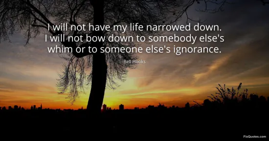 Hooks, Bell. (2026, January 16). I will not have my life narrowed down. I will not bow down to somebody else's whim or to someone else's ignorance. FixQuotes. https://fixquotes.com/quotes/i-will-not-have-my-life-narrowed-down-i-will-not-131837/