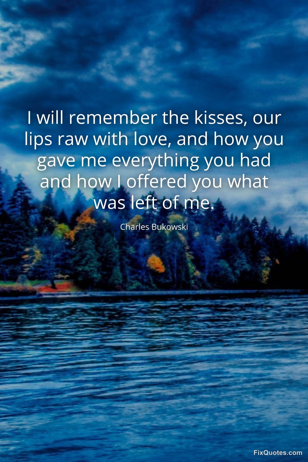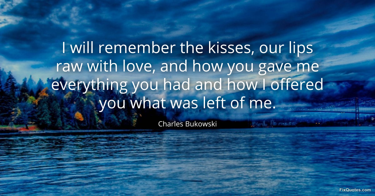 Bukowski, Charles. "I will remember the kisses, our lips raw with love, and how you gave me everything you had and how I offered you what was left of me." FixQuotes. February 10, 2026. https://fixquotes.com/quotes/i-will-remember-the-kisses-our-lips-raw-with-love-185191/.