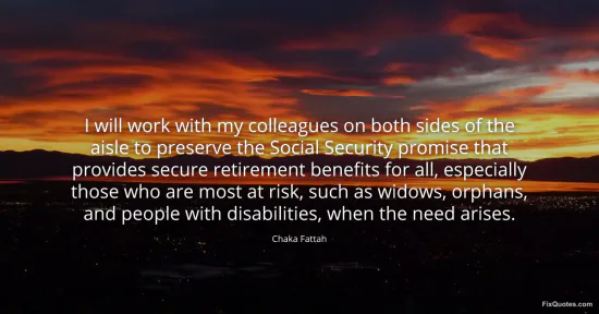 Fattah, Chaka. (2026, February 17). I will work with my colleagues on both sides of the aisle to preserve the Social Security promise that provides secure retirement benefits for all, especially those who are most at risk, such as widows, orphans, and people with disabilities, when the need arises. FixQuotes. https://fixquotes.com/quotes/i-will-work-with-my-colleagues-on-both-sides-of-109697/