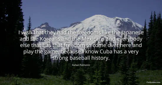 Palmeiro, Rafael. "I wish that they had the freedoms like the Japanese and the Koreans and the Mexicans and everybody else that has that freedom to come over here and play the game, because I know Cuba has a very strong baseball history." FixQuotes. January 17, 2026. https://fixquotes.com/quotes/i-wish-that-they-had-the-freedoms-like-the-80543/.