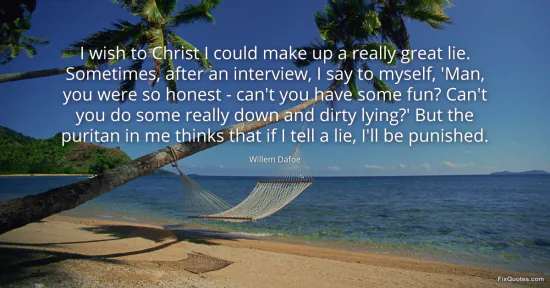 Dafoe, Willem. "I wish to Christ I could make up a really great lie. Sometimes, after an interview, I say to myself, 'Man, you were so honest - can't you have some fun? Can't you do some really down and dirty lying?' But the puritan in me thinks that if I tell a lie, I'll be punished." FixQuotes. January 16, 2026. https://fixquotes.com/quotes/i-wish-to-christ-i-could-make-up-a-really-great-99887/.