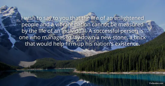 I, King Hussein. (2026, January 15). I wish to say to you that the life of an enlightened people and a vibrant nation cannot be measured by the life of an individual. A successful person is one who manages to lay down a new stone, a brick that would help firm up his nation's existence. FixQuotes. https://fixquotes.com/quotes/i-wish-to-say-to-you-that-the-life-of-an-166149/