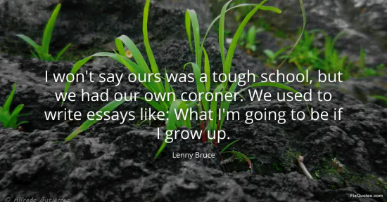 Bruce, Lenny. "I won't say ours was a tough school, but we had our own coroner. We used to write essays like: What I'm going to be if I grow up." FixQuotes. January 17, 2026. https://fixquotes.com/quotes/i-wont-say-ours-was-a-tough-school-but-we-had-our-54436/.