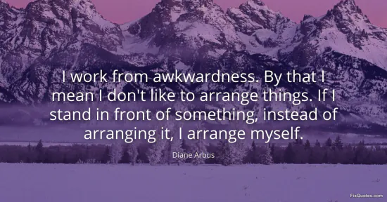 Arbus, Diane. (2026, January 18). I work from awkwardness. By that I mean I don't like to arrange things. If I stand in front of something, instead of arranging it, I arrange myself. FixQuotes. https://fixquotes.com/quotes/i-work-from-awkwardness-by-that-i-mean-i-dont-4014/