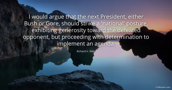 Allen, Richard V. "I would argue that the next President, either Bush or Gore, should strike a 'national' posture, exhibiting generosity toward the defeated opponent, but proceeding with determination to implement an agenda." FixQuotes. January 15, 2026. https://fixquotes.com/quotes/i-would-argue-that-the-next-president-either-bush-161352/.