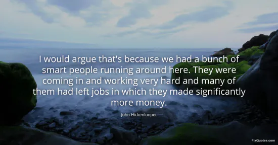 Hickenlooper, John. (2026, January 16). I would argue that's because we had a bunch of smart people running around here. They were coming in and working very hard and many of them had left jobs in which they made significantly more money. FixQuotes. https://fixquotes.com/quotes/i-would-argue-thats-because-we-had-a-bunch-of-100757/
