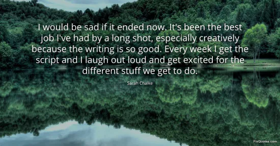 Chalke, Sarah. "I would be sad if it ended now. It's been the best job I've had by a long shot, especially creatively because the writing is so good. Every week I get the script and I laugh out loud and get excited for the different stuff we get to do." FixQuotes. January 16, 2026. https://fixquotes.com/quotes/i-would-be-sad-if-it-ended-now-its-been-the-best-106628/.